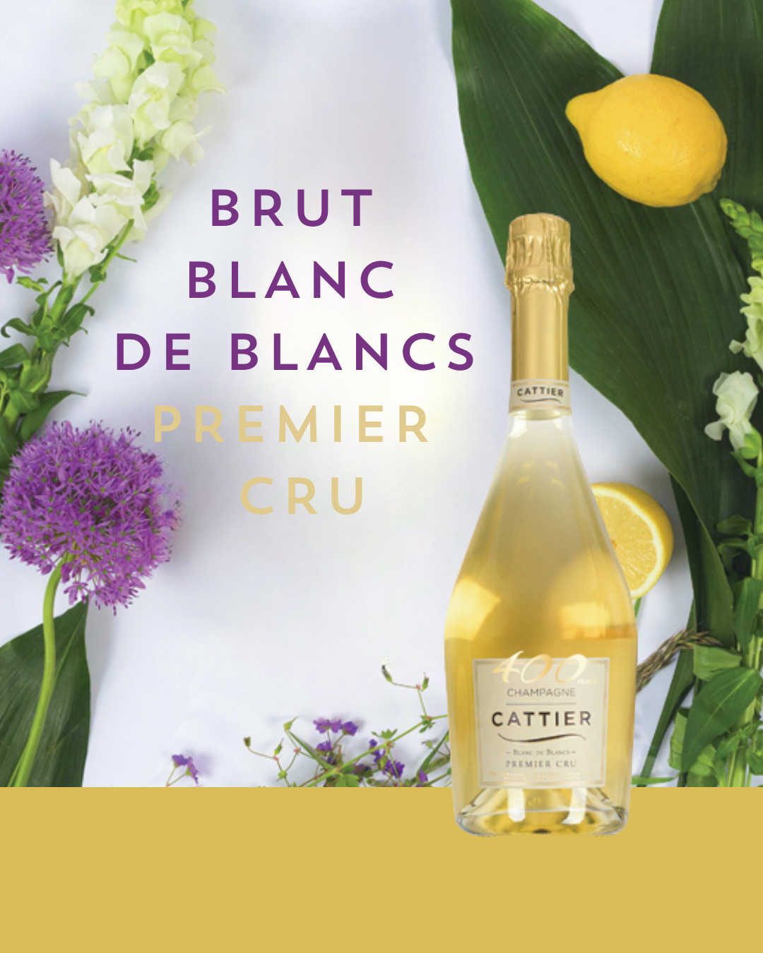 Champagne Cattier Brut Blanc de Noirs Premier Cru. Al calice si presenta con un colore dorato chiaro e con bollicine sottili ed eleganti. Il sapore è gourmand, con aromi di prugna, pesca, albicocca e fragola, che evolvono in note mielate.